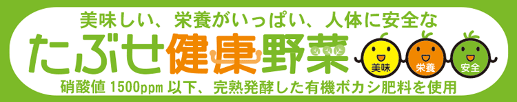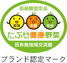 田布施地域交流館は、消費者の皆様においしい野菜を提供するため、野菜に含まれている硝酸塩を抑えた野菜作りを生産者と一体になって取り組み、団体では全国で初めて低硝酸野菜を完成し、平成27年11月に「たぶせ健康野菜」として、ブランド化しました。 ●ブランド認定品 |