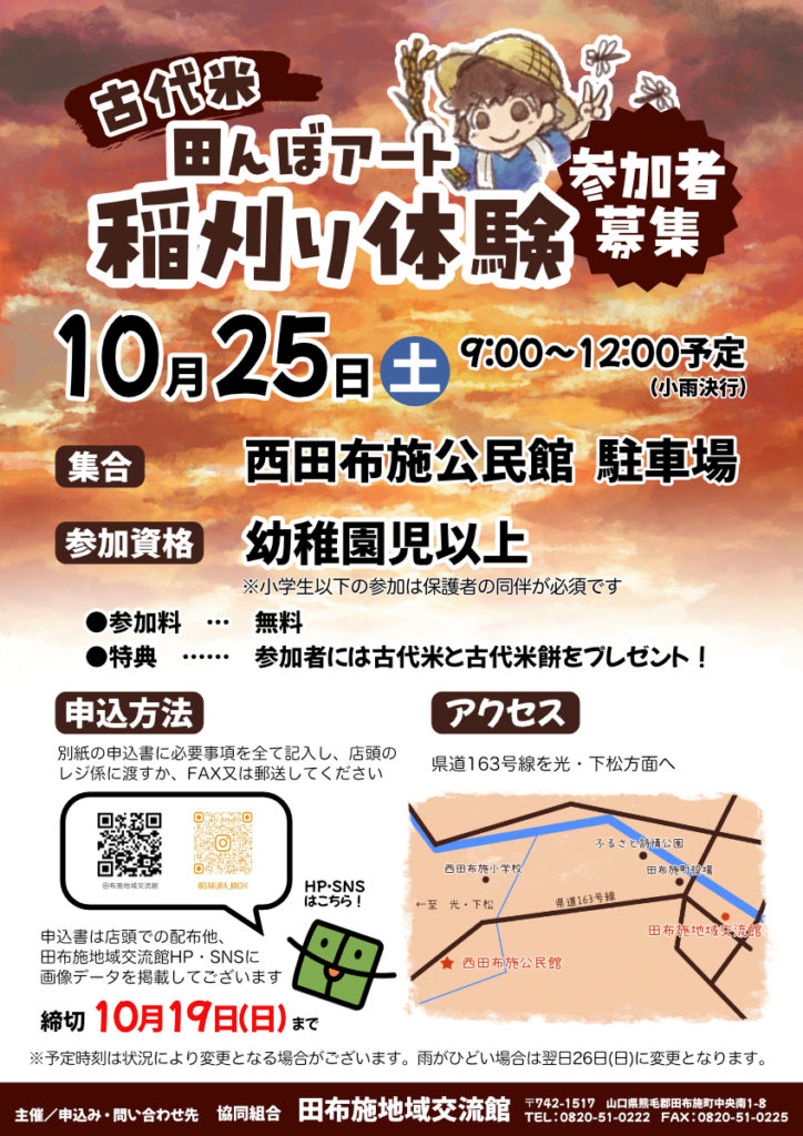 【10/25】古代米田んぼアート稲刈り体験2025を開催いたします! 2025/09/21 6月にみんなで植えた古代米が収穫の時期を迎えました!(*’ω’*) 酷暑を乗り越え、やってまいりましたお米の収穫最盛期です! 今年も古代米田んぼアート稲刈り体験を開催いたします! お申し込みはこちらの申込書(PDFファイル)をダウンロード・印刷後ご記入していただき、店頭までお持ちいただくか、FAXまたは郵送にてお申し込みください。 申込書は店内でも配布しております。 〆切は10月19日(日)到着分までとなっております。 たくさんのご応募お待ちしております!(/・ω・)/